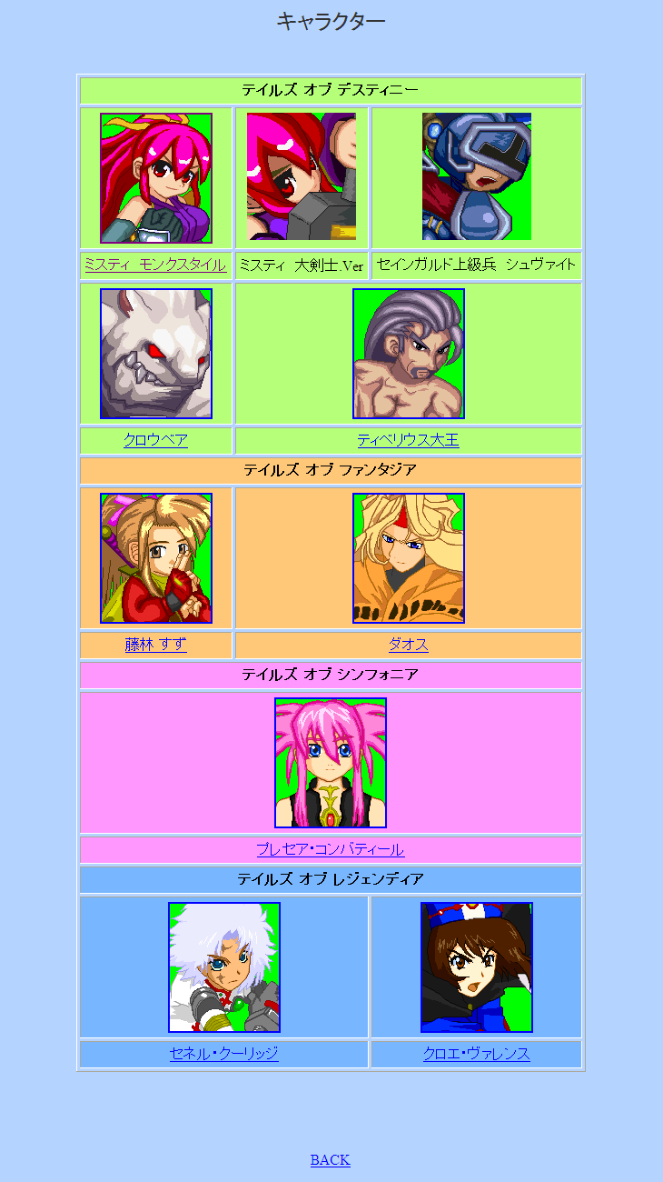 トップページから【キャラクター】をクリックすると、各作品ごとにキャラが分かれて配置されているページに飛びます。キャラクターのフェイスか名前をクリックするとそのキャラのページに飛びます。